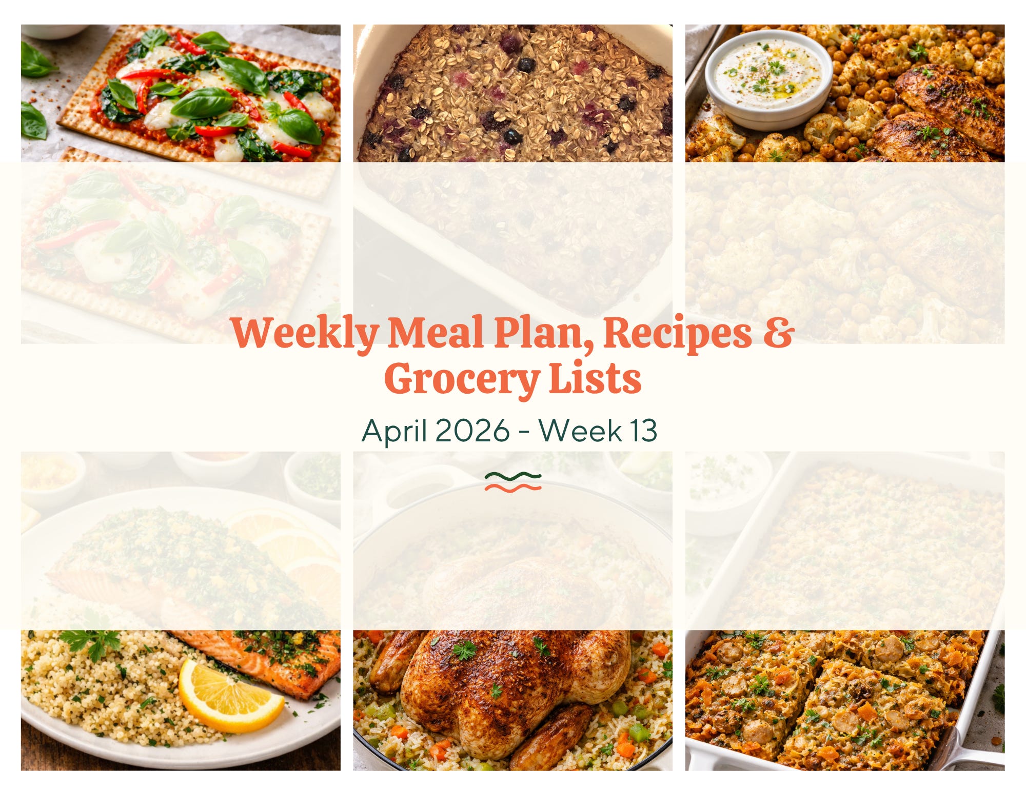 I like to label meals by day so I can intentionally plan leftovers or takeout, but feel free to move things around in whatever way works best for your family. I’ve bolded the days with a freshly cooked recipe to make it easy to follow at a glance.